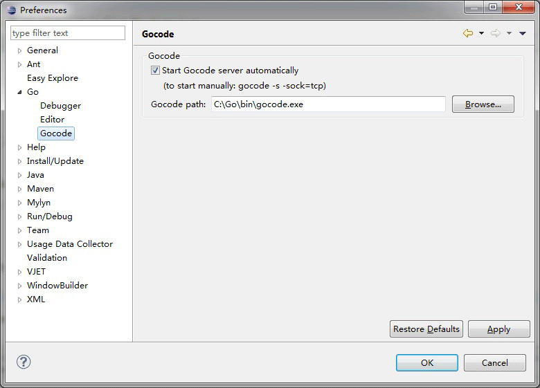 (2).配置Gocode(可选,代码补全),设置Gocode路径为之前生成的gocode.exe文件