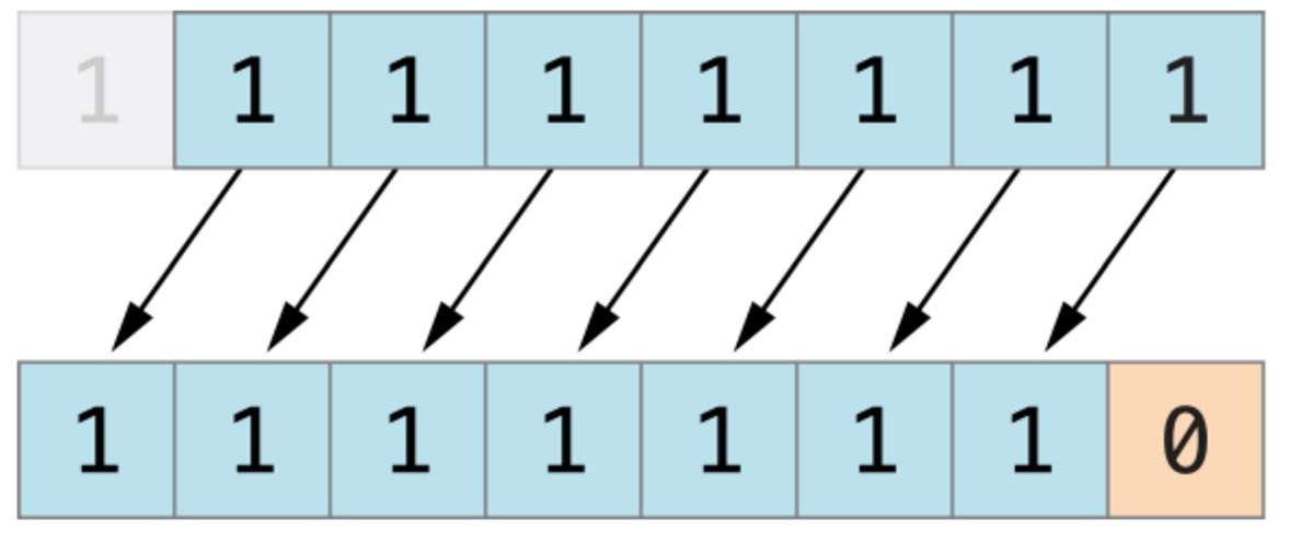 下图展示了11111111 << 1(11111111 左移一位)的结果。蓝色数字表示被移动位,灰色表示被丢弃位,空位用橙色的0填充。 ![]() |
