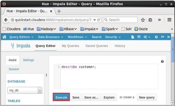 打开Impala查询编辑器并键入其中的describe语句,然后单击执行按钮,如下面的屏幕截图所示。
