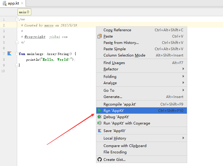 /** * Created by maxsu on 2017/5/19. * * @copyright web3.com */ fun main(args: Array<String>) { println("Hello, World!"); }现在我们可以运行应用程序。最简单的方法是点击Gotlin中的Kotlin图标或在代码中点击右键,在弹出的选项中选择【Run’AppKt’】。