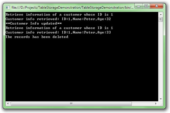 继承自 TableServiceEntity类的 CustomerInfo 类定义了每条数据的模式。需要注意的是,与一般的关系型数据库不同, Table Storage并不要求一个表中的所有数据都遵循同一模式。举例来说,在一个表中,可以存储一条有三个字段的记录和一条只有两个字段的记录。这也是我们为什么说可以把 Table Storage想象为 XML文件的原因。当然在通常情况下我们都会需要在一个表中存储同一模式的数据。这时候我们就可以使用 System.Data.Services.Client程序集来为 Table Storage创建客户端程序。当我们需要在一个表中存储不同模式的数据时我们可以手动构建和发送 REST请求。