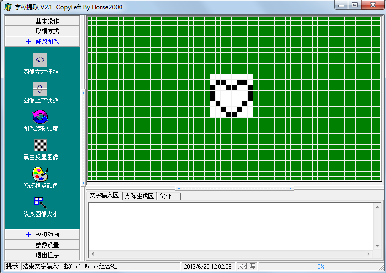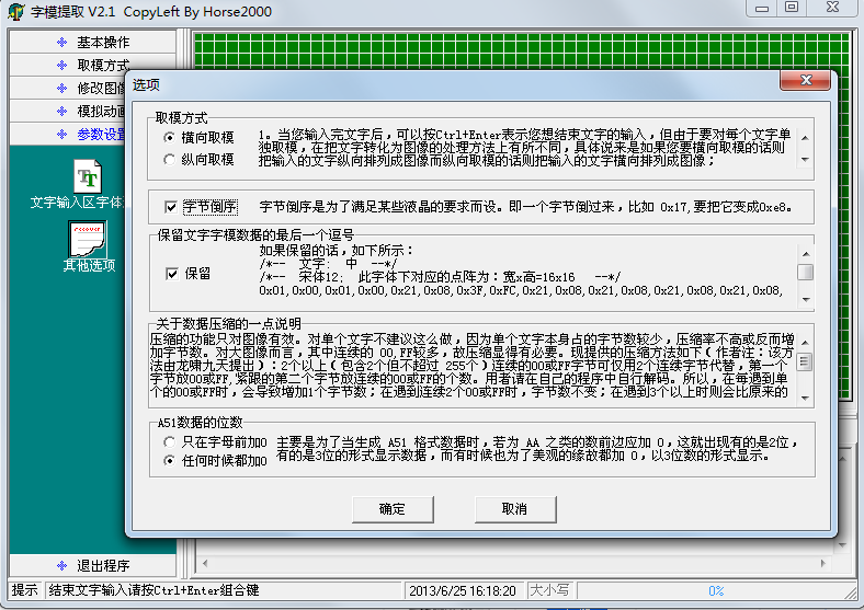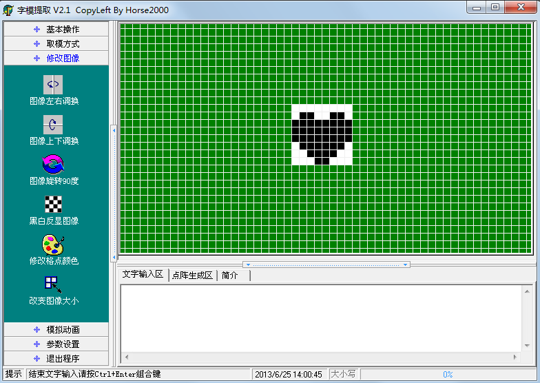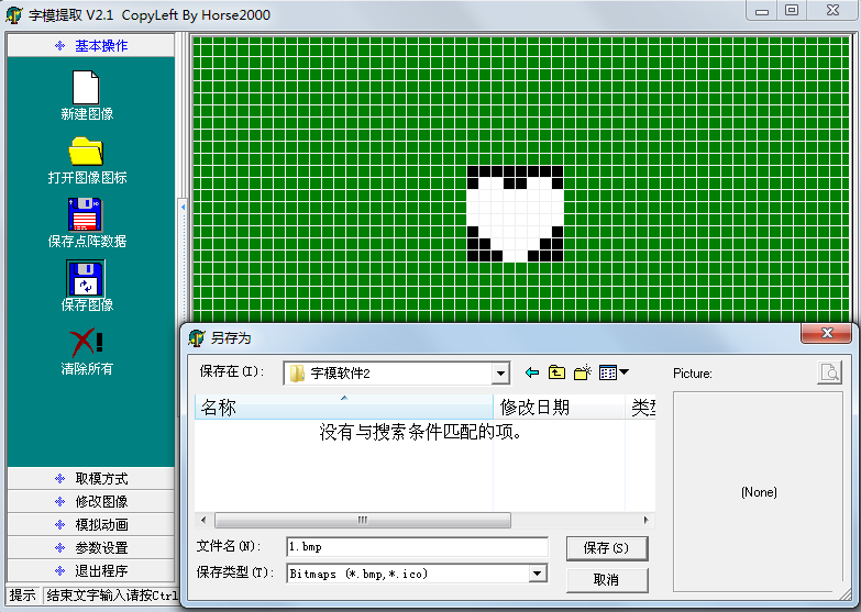 我们要显示花样的时候,往往要先做出来一些小图形,这些小图形的数据要转换到我们的程序当中去,这个时候就需要取模软件。给大家介绍一款简单的取模软件,这种取模软件在网上都可以下载到,大家来了解一下如何使用,先看一下操作界面,如图7-3所示。