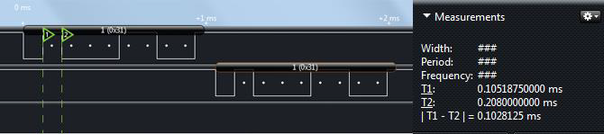 以上边的波形为例,左边第一位是起始位0,从低位到高位依次是10001100,顺序倒一下,就是数据 0x31,也就是 ASCII 码表里的‘1’。大家可以注意到分析仪在每个数据位都给标了一个白色的点,表示是数据,起始位和无数据的时候都没有这个白点。时间标 T1 和 T2 的差值在右边显示出来是 0.102 ms,大概是9600分之一,稍微有点偏差,在容许范围内即可。通过图11-7,我们可以清晰的了解了串口通信的收发的详细过程。
