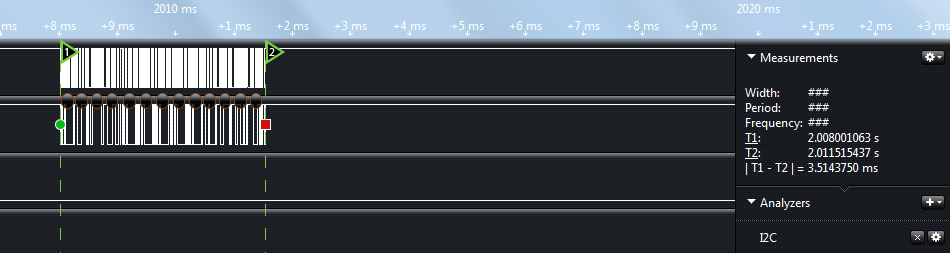 多字节写入和页写入程序都编写出来了,而且页写入的程序我们还特地跨页写的数据,它们的写入时间到底差别多大呢。我们用一些工具可以测量一下,比如示波器,逻辑分析仪等工具。我现在把两次写入时间用逻辑分析仪给抓了出来,并且用时间标签 T1 和 T2 标注了开始位置和结束位置,如图14-5和图14-6所示,右侧显示的|T1-T2|就是最终写入5个字节所耗费的时间。