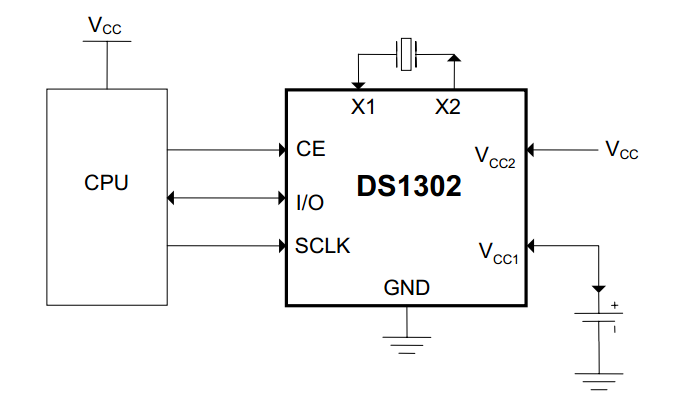 DS1302 电路的一个重点就是晶振电路,它所使用的晶振是一个 32.768 k 的晶振,晶振外部也不需要额外添加其它的电容或者电阻了。时钟的精度,首先取决于晶振的精度以及晶振的引脚负载电容。如果晶振不准或者负载电容过大或过小,都会导致时钟误差过大。