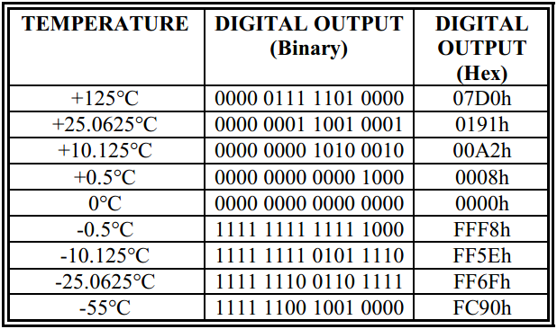 二进制数字最低位变化1,代表温度变化0.0625度的映射关系。当0度的时候,那就是 0x0000,当温度125度的时候,对应十六进制是 0x07D0,当温度是零下55度的时候,对应的数字是 0xFC90。反过来说,当数字是 0x0001 的时候,那温度就是0.0625度了。