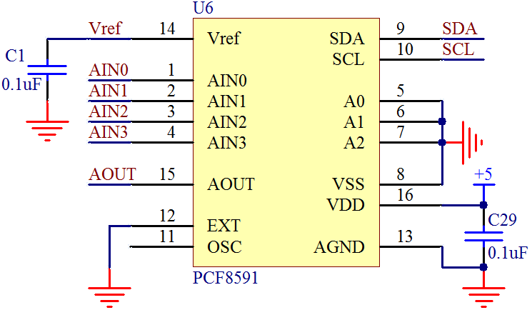 其中引脚1、2、3、4是4路模拟输入,引脚5、6、7是 I2C 总线的硬件地址,8脚是数字地 GND,9脚和10脚是 I2C 总线的 SDA 和 SCL。12脚是时钟选择引脚,如果接高电平表示用外部时钟输入,接低电平则用内部时钟,我们这套电路用的是内部时钟,因此12脚直接接 GND,同时11脚悬空。13脚是模拟地 AGND,在实际开发中,如果有比较复杂的模拟电路,那么 AGND 部分在布局布线上要特别处理,而且和 GND 的连接也有多种方式,这里大家先了解即可。在我们板子上没有复杂的模拟部分电路,所以我们把 AGND 和 GND 接到一起。14脚是基准源,15脚是 DAC 的模拟输出,16脚是供电电源 VCC。
