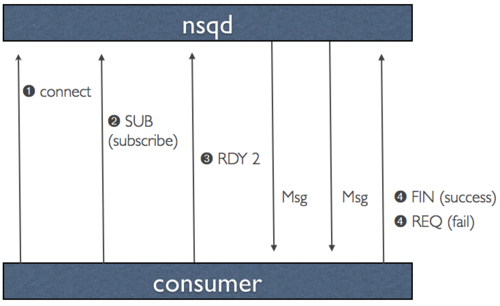 当客户端连接到 nsqd 和并订阅到一个通道时,它被放置在一个 RDY 为 0 状态。这意味着,还没有信息被发送到客户端。当客户端已准备好接收消息发送,更新它的命令 RDY 状态到它准备处理的数量,比如 100。无需任何额外的指令,当 100 条消息可用时,将被传递到客户端(服务器端为那个客户端每次递减 RDY 计数)。