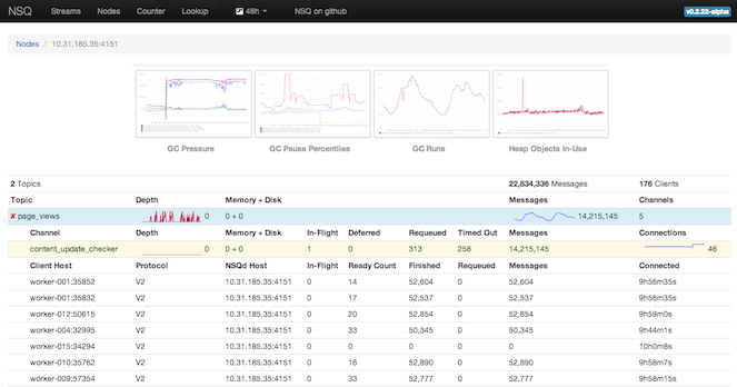 首先,重要的是要了解 GC 在真实的工作负载下是如何表现。为此,nsqd 以 statsd 格式发布的 GC 统计(伴随着其他的内部指标)。nsqadmin 显示这些度量的图表,让您洞察 GC 的影响,频率和持续时间: