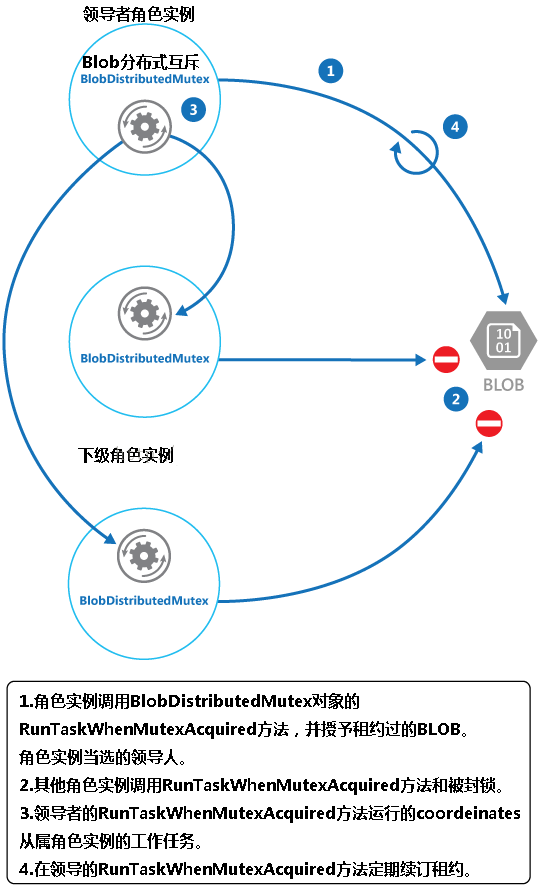 在列入可用于本指南中的示例代码中 LeaderElection 解决方案 DistributedMutex 项目展示了如何使用租赁在 Azure 存储 BLOB 提供了一种机制,实现共享的分布式互斥。此互斥锁可以用来选择在 Azure 云服务的领导者之间的一组角色的实例。第一个角色实例获得租约当选的领导人,并保持领先直至其租赁或直到它无法续租。其他角色实例可以继续监视在领导不再可用的情况下将 BLOB 租赁。