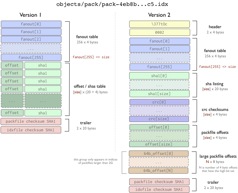 在第 1 版中, offset(偏移)和 SHA 值存在在同一位置。但是在第 2 版中,SHA 值,CRC 值和 offset 被放在不同的表中。两个版本的文件最后都是索引文件以及指向的打包文件的 CRC 校验值。