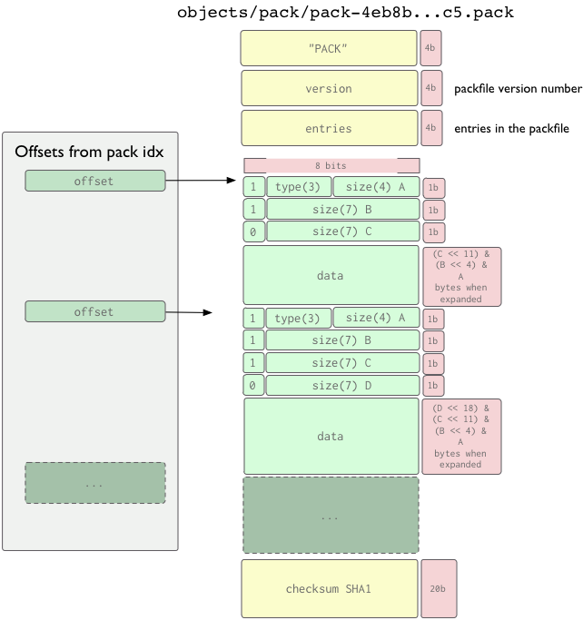 头部之后是一系列按照 SHA 值排序的打包对象,每一个打包对象包含了头部和内容。打包文件的尾部是该文件中所有(已排序) SHA 值的 SHA1 校验值(20 字节长)(译注:即按照排序好的顺序进行迭代 SHA1 运算)。