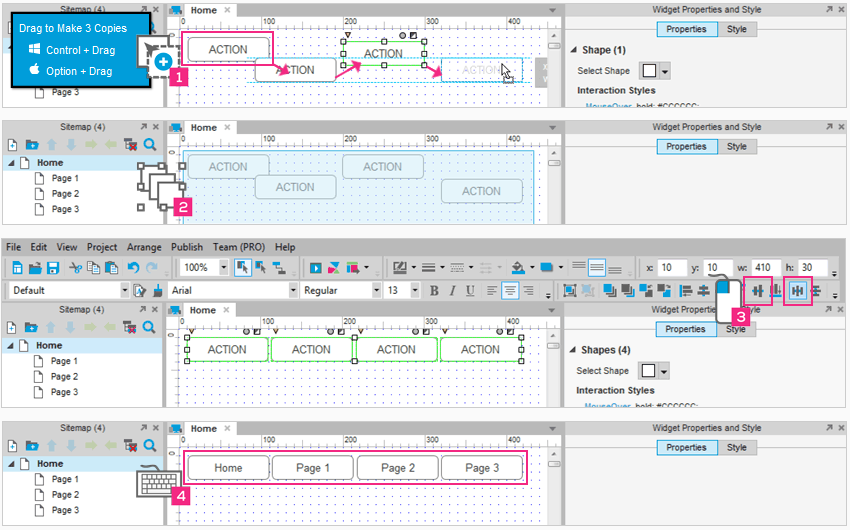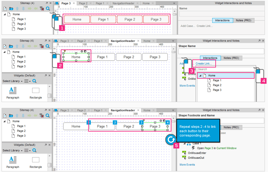 选择,然后如图所示给每个按钮命名。按钮的名字应该匹配 Sitemap 中的页面。