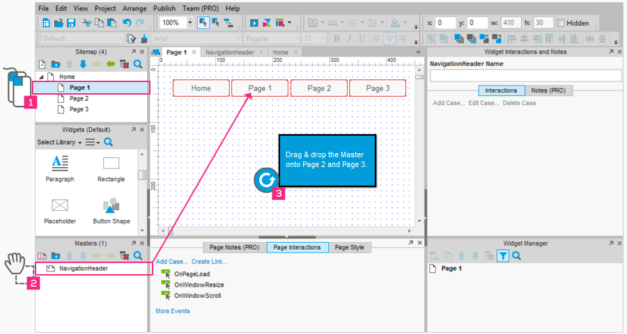 从 Masters 窗口拖动 Master 到“页面 1”的设计区域上。