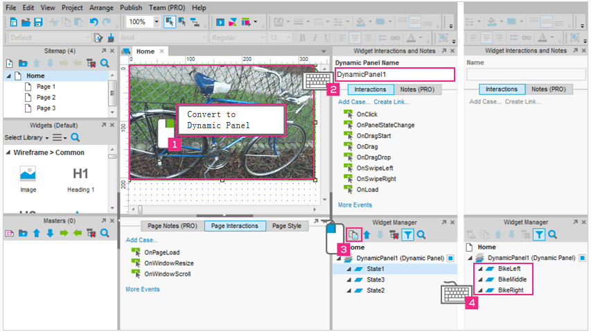 使用“动态面板”创建一个简单的图像旋转。首先将图像小部件放置在每个面板的状态。然后,添加一个交互 Button Shape 使状态能够生动起来。