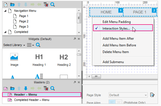 按下 Shift 键,逐个选中菜单部件的所有导航项。全选后,对它们右键单击选中 Interaction Styles... 选项,会弹出一个 Set Interaction Styles 对话框。