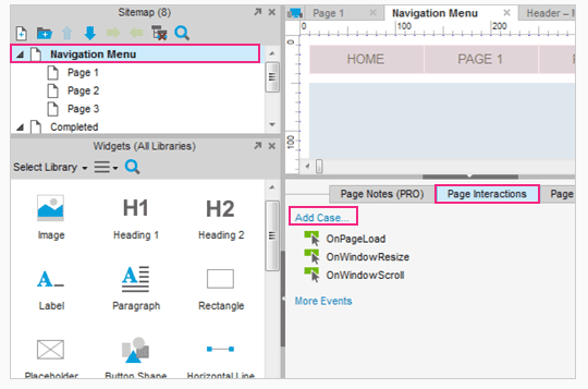 首先打开AxureNavigationMenu.rp 然后从 Masters 页面打开 Header – Menu 。
