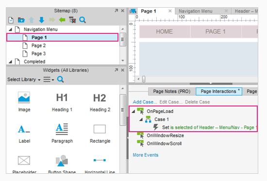 就像我们为 Home 页面所做的,通过相同的菜单为第一到三页面添加一个 OnPageLoad 事例到它们的 selected style。例如,页面 1 的 OnPageLoad 事例,设置 Nav – Page 1 到它的 selected style ,然后为 Page 2 和 Page 3 使用相同的操作。