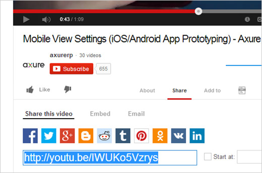 内联框架(inline frames)可以用来为你的原型添加任意外部 HTML 内容,但他们用于嵌入外站视频(例如 YouTube、Vimeo 等)或者在线地图(例如谷歌地图)时显得特别有用。其中最难的地方也不过是如何从这些外站获取目标 URL 而已。一个嵌入式视频和地图的示例工程可以在 AxureWebsite.zip 内找到,双击内联框架就能看见其目标 URL。