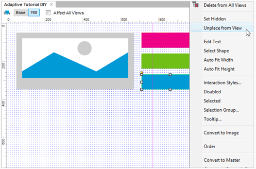 在自适应视图选择工具栏中,选择 768 视图,然后 unplace 蓝色矩形。您可以通过按下删除或右键单击 [Unplace from view]。这将从 768 视图中删除小部件,但不是从基础视图(其父图)。