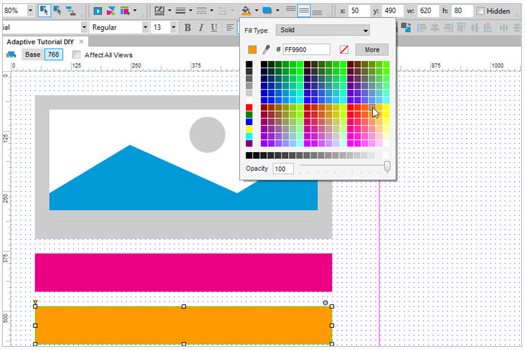 选择绿色矩形,并改变填充颜色为橙色。切换回基本视图并注意颜色的变化只是影响了 768 视图,因为基础视图的子视图的样式属性是不能影响所有视图的。