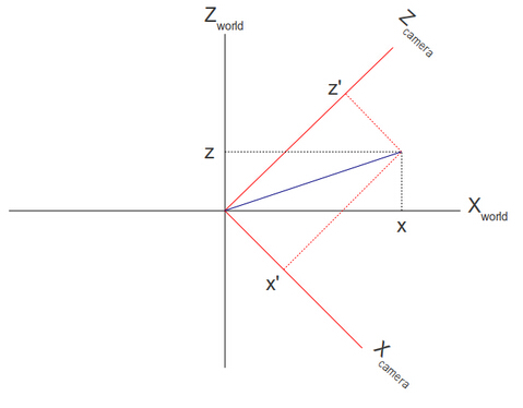 上面的例子很简单,因为相机的方向已经沿着 Z 轴负方向,并且通常相机的朝向都是沿着坐标轴的。但是如果相机指向其他方向将会发生什么呢?看下面的图片。简单的说,这是一个 2D 坐标系统,我们沿着 Y 轴的负方向观察。