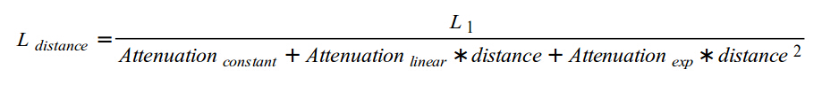 这个公式产生的 3D 视觉效果不是很好。例如,当距离变得非常小的时候,光线的强度就会趋于无穷大。另外,开发者除了可以设置光的初始强度外,并没有其他手段来控制光照的最后效果。这种做法局限性太大了。因此,我们给这个公式添加一些因子,来让它变得更灵活: