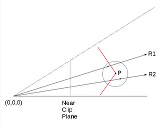 P 点位于红色表面上,P 点周围的红色点(位于射线 R2 上)和绿色点(位于射线 R1 上)都是 P 点周围生成的随机点。绿点位于几何体之外,红点位于几何体之内(因此会增加 P 点被遮挡的程度)。圆圈表示随机点生成的范围(我们不希望随机点离原始顶点太远)。 R1 和 R2 是从相机(位于 0,0,0 点)分别到红点和绿点的两条射线。他们与几何体相交于一点。为了计算出环境光遮挡因子我们需要分别将红点和绿点的 Z 值与他们对应的几何体顶点(分别是射线 R1 和 R2 与几何体的交点)的 Z 值进行比较。对于红点和绿点的 Z 值我们可以直接得到(在视图空间下,毕竟我们直接生成了这些点的坐标),但是我们如何才能得到上面的交点的 Z 值呢?