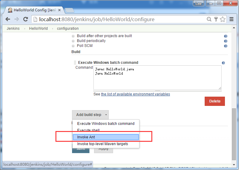 第2步 - 浏览到部分添加生成步骤和选择调用Ant选项。