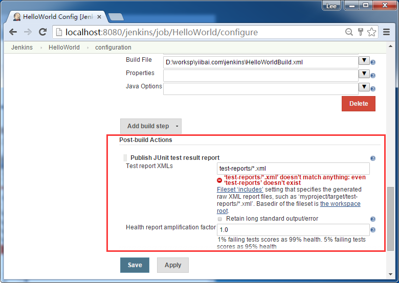 第6步 - 在测试报告XML,进入如下图所示的位置。确保报表是其在 Hello World 项目工作区创建的文件夹中。“*.xml” 主要是告诉Jenkins 这是由JUnit测试用例运行产生的结果XML文件。然后被转换成以后可以查看报告的 XML 文件。完成后,单击在最后保存(Save)选项。