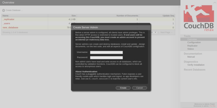 注意:创建管理用户可防止未经授权的用户删除和修改数据库,设计文档和CouchDB配置。 但是,它不会阻止其它创建或访问文档。