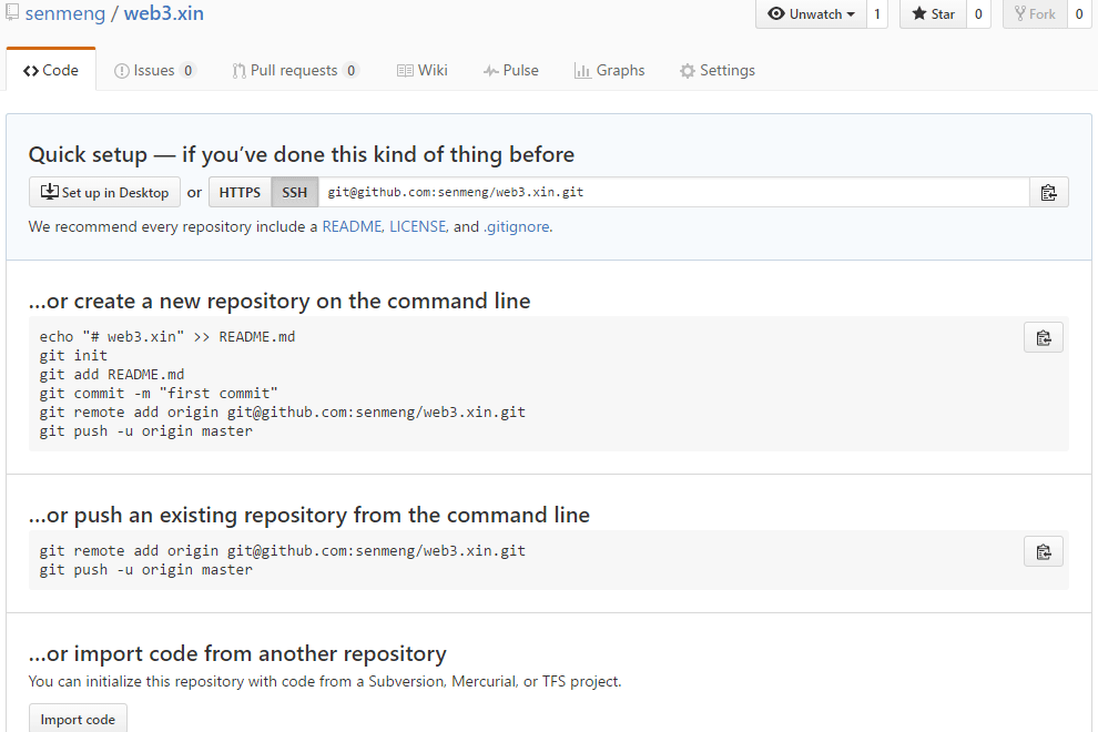 $ ls README w3cschool芝麻教程测试.txt test.txt $ git remote add origin git@github.com:tianqixin/web3.xin.git $ git push -u origin master Counting objects: 21, done. Delta compression using up to 4 threads. Compressing objects: 100% (15/15), done. Writing objects: 100% (21/21), 1.73 KiB | 0 bytes/s, done. Total 21 (delta 4), reused 0 (delta 0) To git@github.com:tianqixin/web3.xin.git * [new branch] master -> master Branch master set up to track remote branch master from origin.