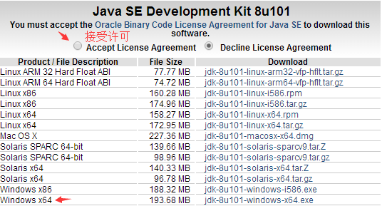 在下载页面中你需要选择接受许可,并根据自己的系统选择对应的版本,本文以 Window 64位系统为例: