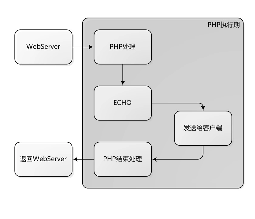 现在, PHP的ECHO, 将直接把内容交给Apache, PHP在执行完成后, 不再等待内容发送给客户端完成, 而直接退出. 而内容会在PHP处理完成以后, 由Apache发送给客户端. 从而加速了ECHO的执行效率.