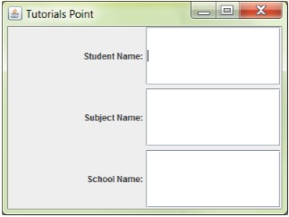 让我们看看下一个用文本框创建输入屏幕的例子。在以下示例中,我们要创建一个包含学生姓名,主题和学校名称文本框的表单。在以下示例中,您可以看到以下要点 -