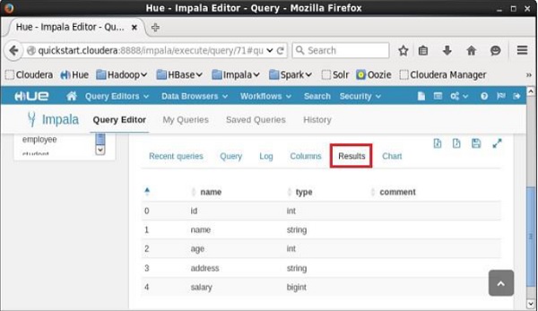 打开Impala查询编辑器并键入其中的describe语句,然后单击执行按钮,如下面的屏幕截图所示。