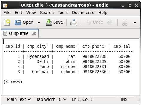 cqlsh> CAPTURE '/home/hadoop/CassandraProgs/Outputfile'