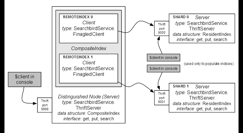 现在,我们把 thrift 服务转换成一个简单的调度机制:为每一个索引实例提供一个 thrift 接口。这是一个强大的抽象,因为它分离了索引实现和服务实现。服务不再知道索引的任何细节;索引可以是本地的或远程的,甚至可能是许多索引的组合,但服务并不关心,索引实现可能会更改但是不用修改服务。