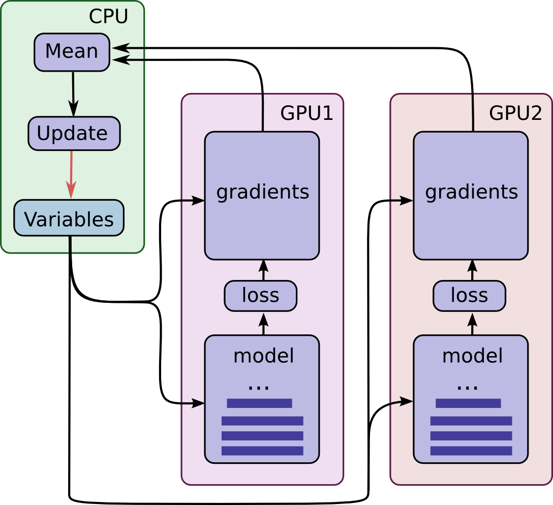 图中所有的GPU是同步运行的。所有GPU中的梯度会累积并求平均值(绿色方框部分)。模型参数会利用所有模型副本梯度的均值来更新。