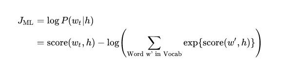 当 score(w_t,h) 计算了文字 w_t 和 上下文 h 的相容性(通常使用向量积)。我们使用对数似然函数来训练训练集的最大值,比如通过: