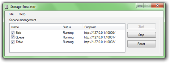 由于我们要在本地模拟环境下测试 Blob Storage,首先,请确保 Storage Emulator已经启动。我们可以找到管理器的进程手动启动或者让 Visual Studio 2010帮助我们启动他。