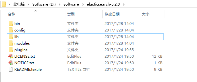 把下载好的文件 elasticsearch-5.2.0.zip 解压到 D:\software\elasticsearch-5.2.0,其目录结构如下所示