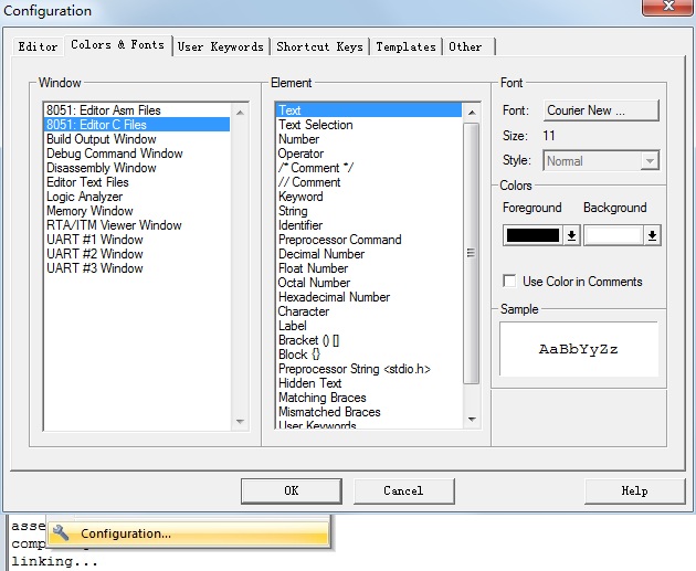 因为我们用的是 C 语言编程,所以我们在 Window 栏中选择 8051:Editor C Files,然后在右侧 Element 栏目里可以选择要修改的内容,一般我们平时用到的,只是其中几项而已,比如:Text——普通文本、Text Selection——选中的文本、Number——数字、/Comment/——多行注释、//Comment——单行注释、Keyword——C 语言关键字、String——字符串,Keil本身都是有默认设置的,可以直接使用默认设置,但如果你觉得不合你的口味,那就在这里更改一下,改完后直接点 OK 看效果就可以了。