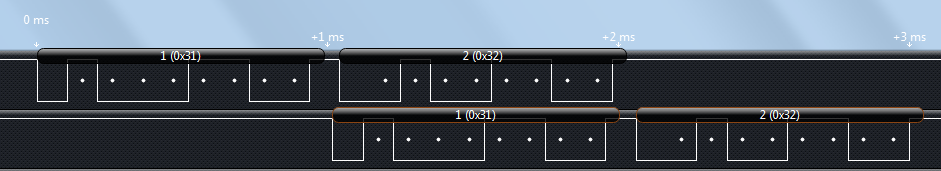 分析仪和示波器的作用,就是把通信过程的波形抓出来进行分析。先大概说一下波形的意思。波形左边是低位,右边是高位,上边这个波形是电脑发送给单片机的,下边这个波形是单片机回发给电脑的。