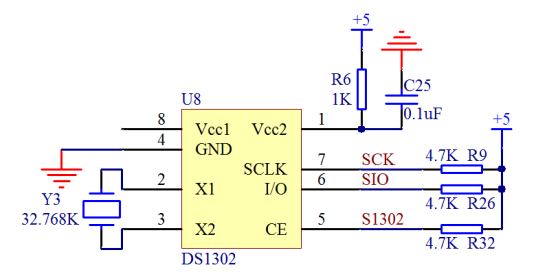 DS1302 电路的一个重点就是晶振电路,它所使用的晶振是一个 32.768 k 的晶振,晶振外部也不需要额外添加其它的电容或者电阻了。时钟的精度,首先取决于晶振的精度以及晶振的引脚负载电容。如果晶振不准或者负载电容过大或过小,都会导致时钟误差过大。