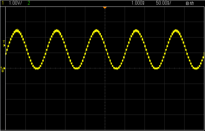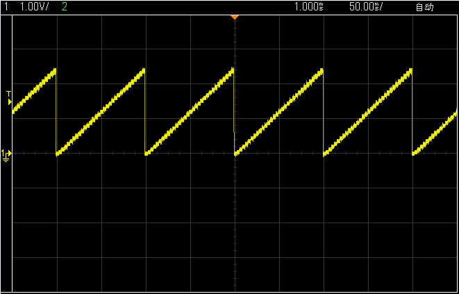 这几张图可以直观的看到我们程序输出的波形。细心的同学会发现我们波形上有很多小锯齿,没有平滑的连起来。这是因为我们 DA 最多只能输出 0~Vref 之间的256个离散的电压值,而不是连续的任意值,所以每个离散值都会持续一定的时间,然后跳变到下一个离散值,于是就呈现出了波形上的这种锯齿。在实际开发中,我们只需要在 DA 后级加一级低通滤波电路,就可以让带锯齿的波形变得平滑起来。