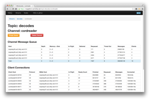 我们还认为重要的是有一个方式来聚合查看,监测,并管理集群。我们建立 nsqadmin 做到这一点。它提供了一个 Web UI 来浏览 topics/channels/consumers 和深度检查每一层的关键统计数据。此外,它还支持几个管理命令例如,移除通道和清空通道(这是一个有用的工具,当在一个通道中的信息可以被安全地扔掉,以使深度返回到 0)。