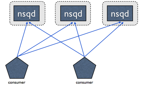 NSQ被设计以分布的方式被使用。nsqd 客户端(通过 TCP )连接到指定话题的所有生产者实例。没有中间人,没有消息代理,也没有单点故障: