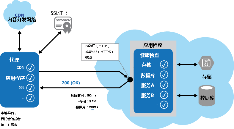 通过将请求发送到应用程序的端点实施健康监测。该应用程序应该执行必要的检查,并返回其状态的指示。