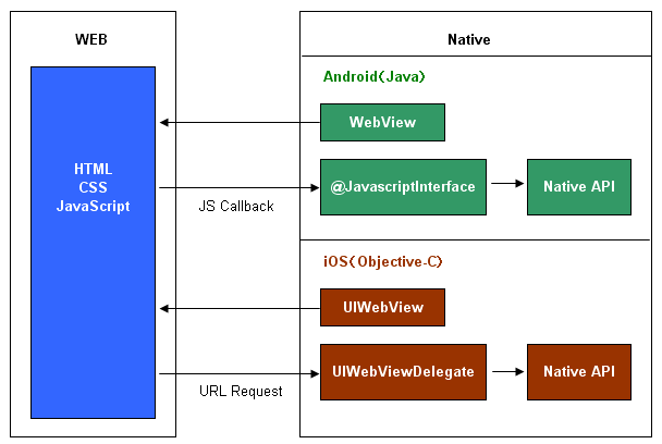 Cordova 应用基于 Webview,所以后台代码和 js 交互都是基于 Webview(Webkit)的接口的。